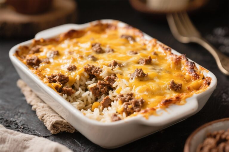 Full recipeCheesy Ground Beef Rice Casserole – Comforting, Easy, and Family-Friendly