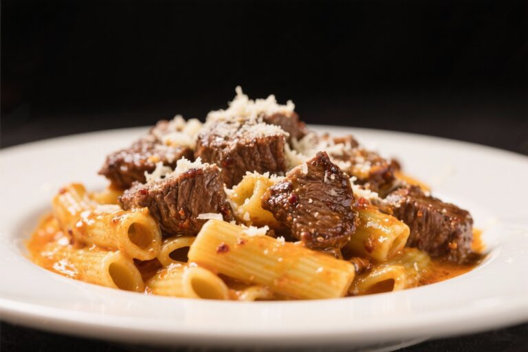 Full recipeCajun Steak Tips in Cheesy Rigatoni Parmesan Sauce – Comfort Food With a Kick