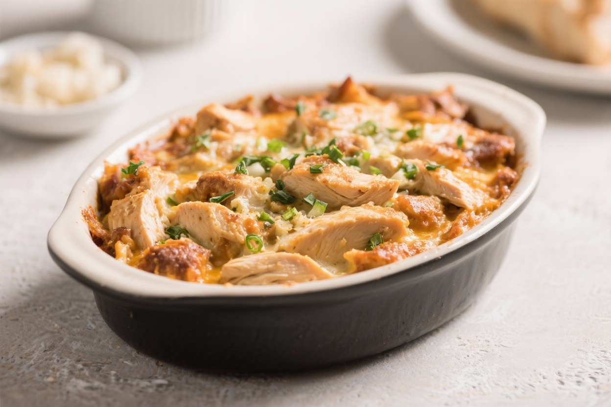 This casserole delivers all the cozy, creamy goodness you expect without pasta or rice. Instead, it relies on chicken, low-carb veggies, and a rich, cheesy sauce to create that comforting texture.